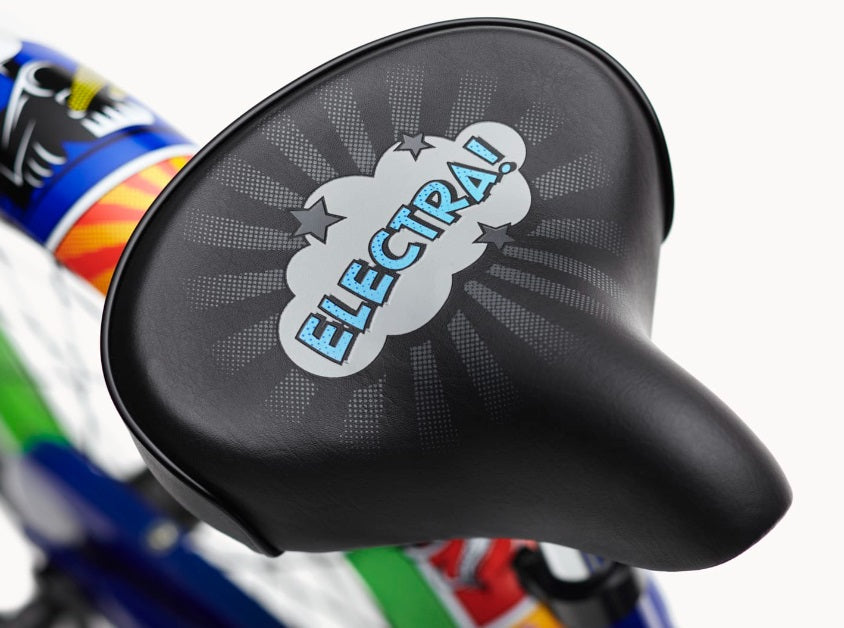 Boom! Kapow! Wham! The Electra Super Sprocket 16" Kid's Bike is ready to help your little rider save the day on two wheels. The Electra Super Sprocket 16" Kid's Bike is like a page from their favorite comic book with action scenes and cityscapes throughout the frame, chainguard and fenders. Embossing on the saddle complete this heroic