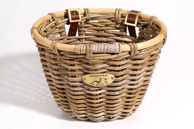 The Nantucket Bike Co. Tuckernuck Bicycle Baskets are made from the highest quality natural rattan fibers. Woven from kubu rattan, the extra thick full-core weave of this Nantucket Bike Co. Tuckernuck Bicycle Basket makes it exceptionally durable. Attaches to front handlebars with two leather straps.