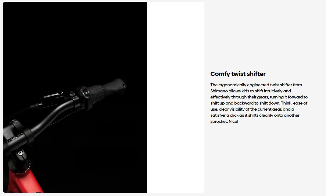 - Child-specific, sporty geometry with a slight kink in the top tube and angular tube profile for a comfy ride and standout style.