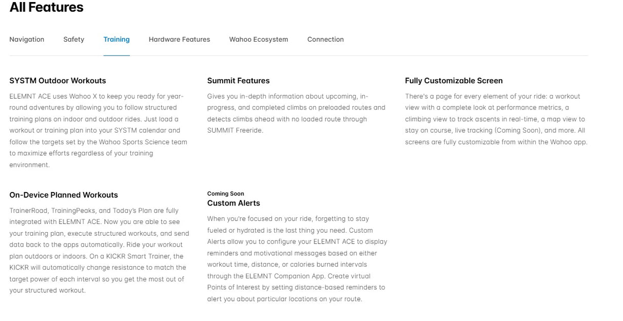 • SYSTM outdoor workouts - ELEMNT ACE uses Wahoo X to keep you ready for year-round adventures by allowing you to follow structured training plans on indoor and outdoor rides. Just load a workout or training plan into your SYSTM calendar and follow the targets set by the Wahoo Sports Science team to maximize efforts regardless of your training environment.
