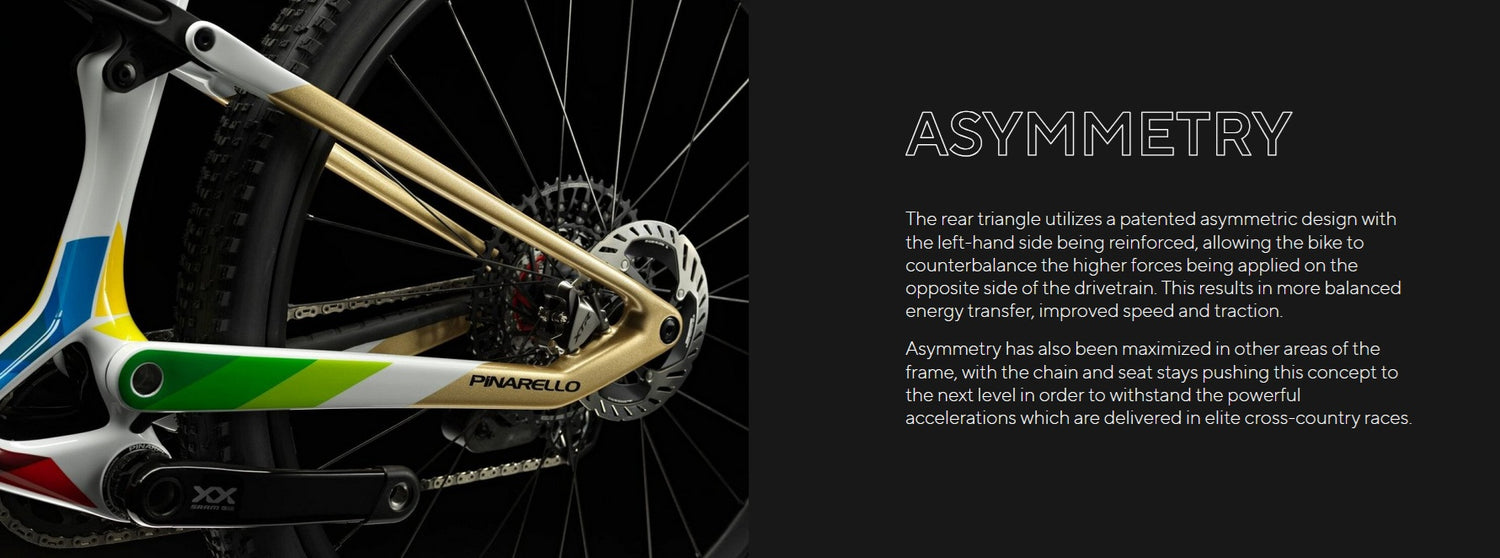 Asymmetry - The rear triangle utilizes a patented asymmetric design with the left-hand side being reinforced, allowing the bike to counterbalance the higher forces being applied on the opposite side of the drivetrain. This results in more balanced energy transfer, improved speed and traction.