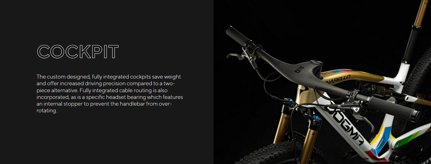 - Cockpit - The custom designed, fully integrated cockpits save weight and offer increased driving precision compared to a two- piece alternative. Fully integrated cable routing is also incorporated, as is a specific headset bearing which features an internal stopper to prevent the handlebar from over-rotating.