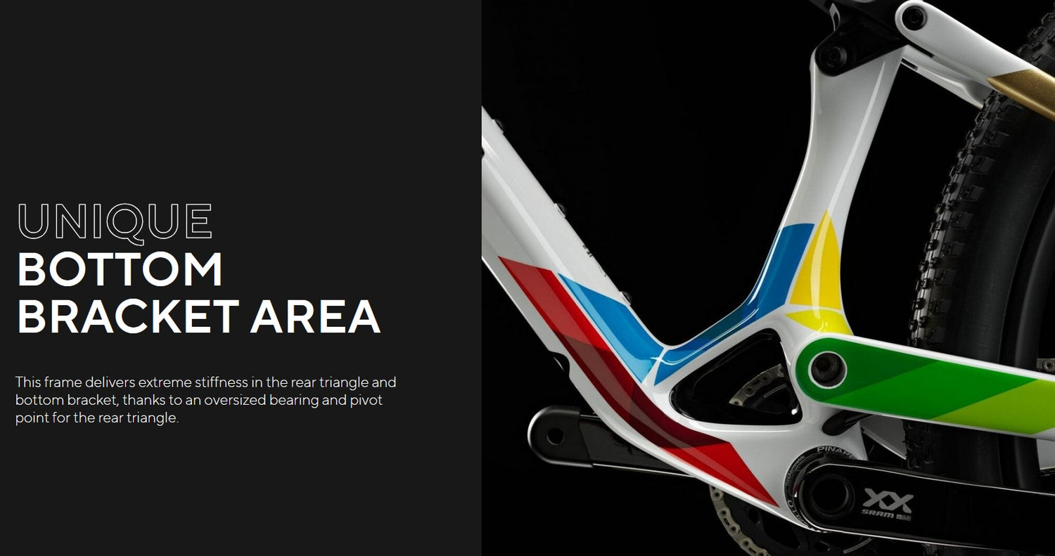 - Unique bottom bracket area - This Pinarello Dogma XC frame delivers extreme stiffness in the rear triangle and bottom bracket, thanks to an oversized bearing and pivot point for the rear triangle.