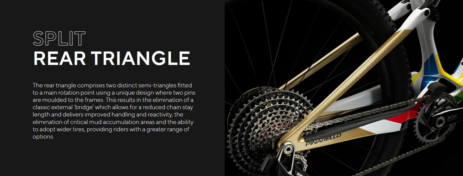 Split Rear Triangle - The rear triangle comprises two distinct semi-triangles fitted to a main rotation point using a unique design where two pins are moulded to the frames. This results in the elimination of a classic external ‘bridge’ which allows for a reduced chain stay length and delivers improved handling and reactivity, the elimination of critical mud accumulation areas and the ability to adopt wider tires, providing riders with a greater range of options.