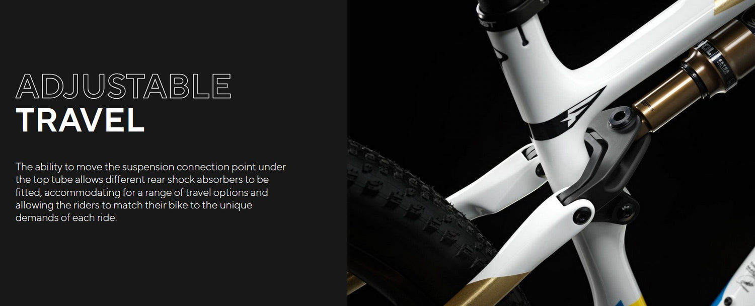 - Adjustable Travel - The ability to move the suspension connection point under the top tube allows different rear shock absorbers to be fitted, accommodating for a range of travel options and allowing the riders to match their bike to the unique demands of each ride.