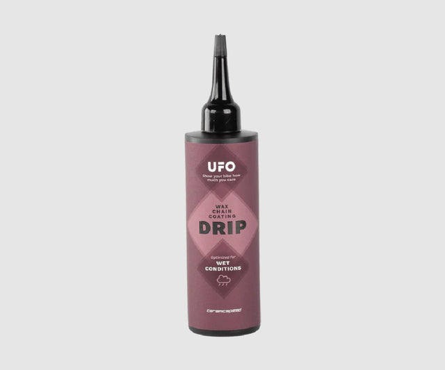 For those riding in consistently wet conditions, our new UFO Drip for Wet Conditions has been uniquely developed to maximize the benefits of a wax chain lubricant, while resisting deterioration through wet riding conditions. 100 ml bottle 8ml, or an 8-gram difference by weight per coating Non-toxic, PFAS-free and biodegradable formula.
