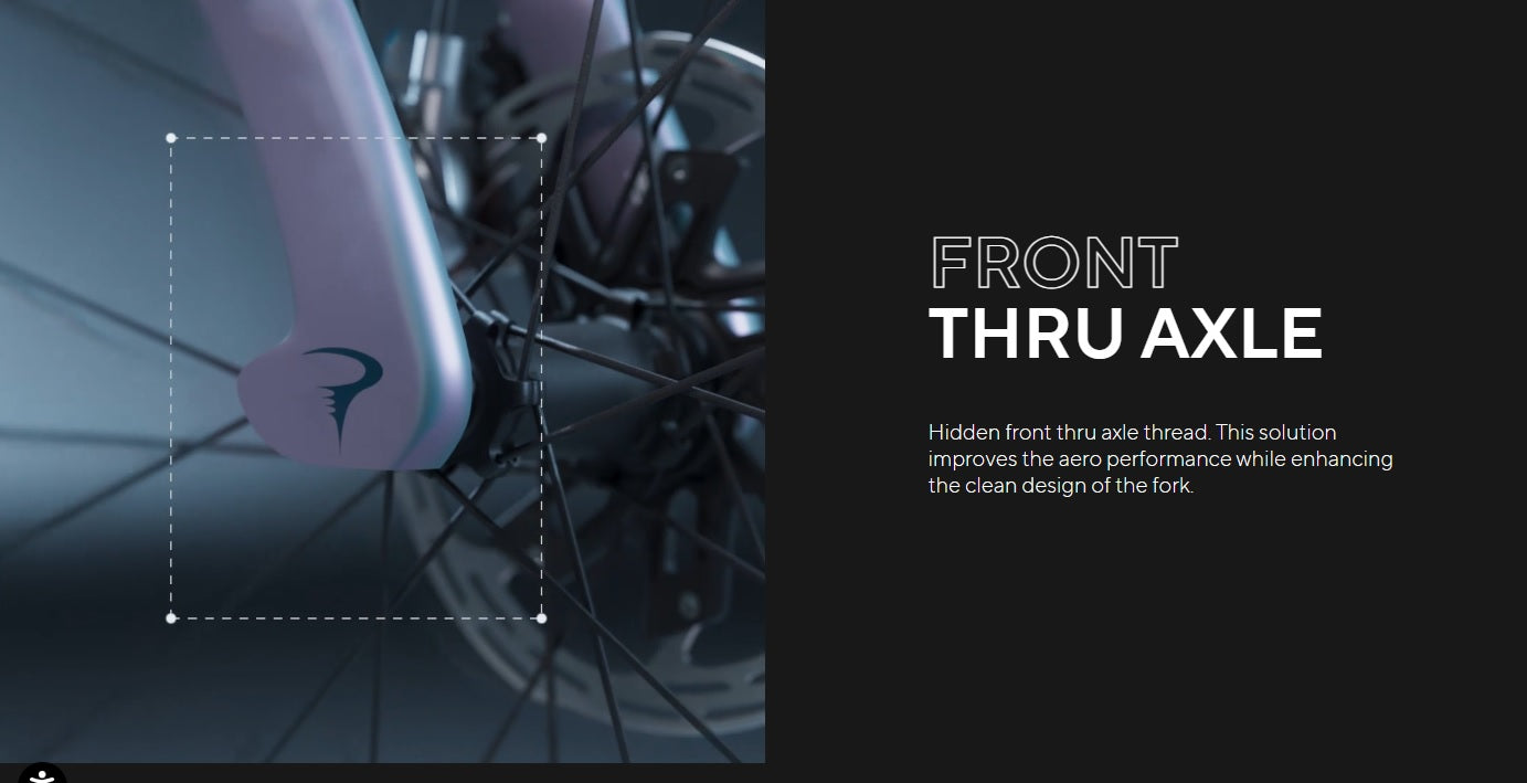 - Front Thru Axle - Hidden front thru axle thread. This solution improves the aero performance while enhancing the clean design of the fork.