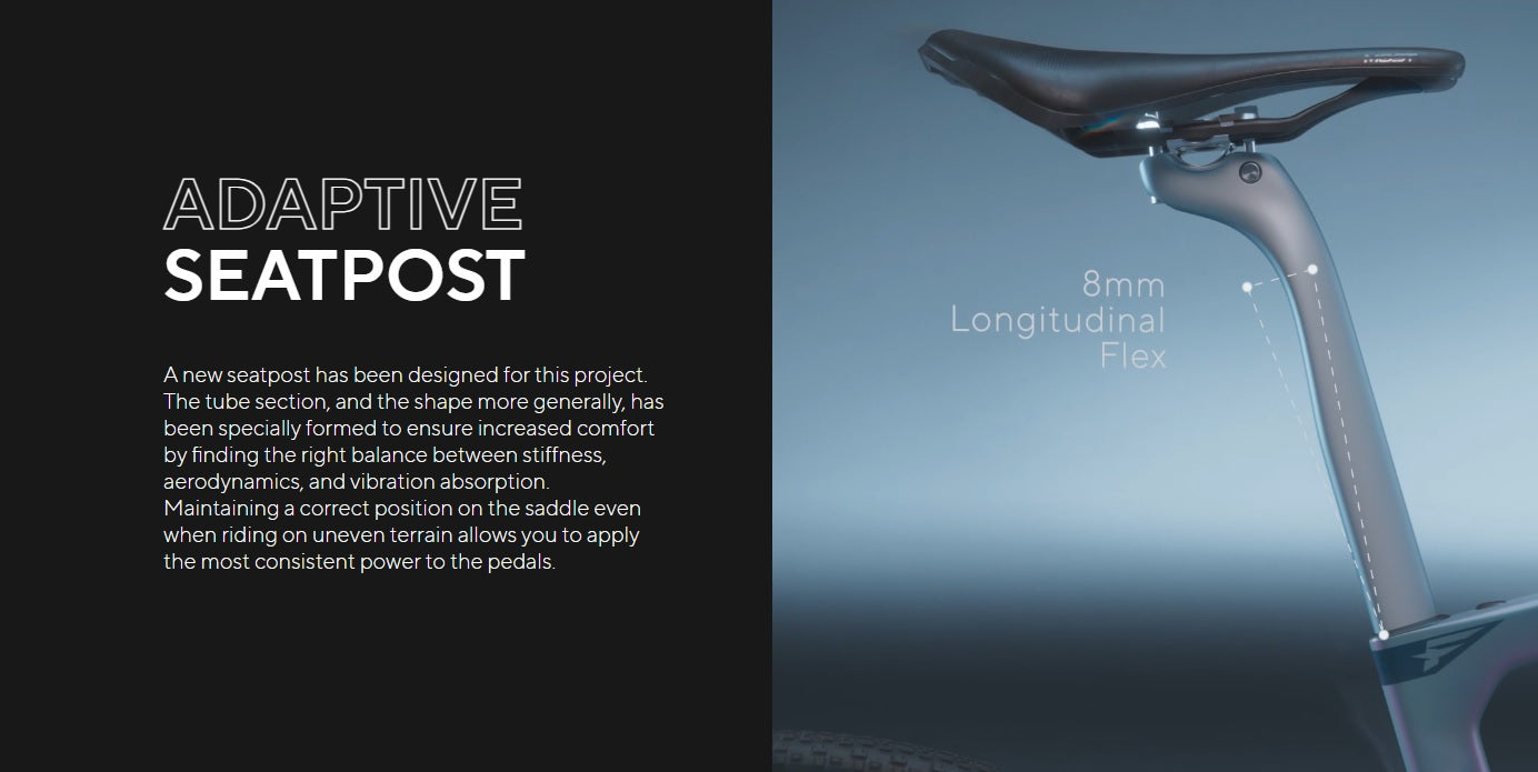 - Adaptive Seatpost - A new seatpost has been designed for this project. The tube section, and the shape more generally, has been specially formed to ensure increased comfort by finding the right balance between stiffness, aerodynamics, and vibration absorption. Maintaining a correct position on the saddle even when riding on uneven terrain allows you to apply the most consistent power to the pedals.