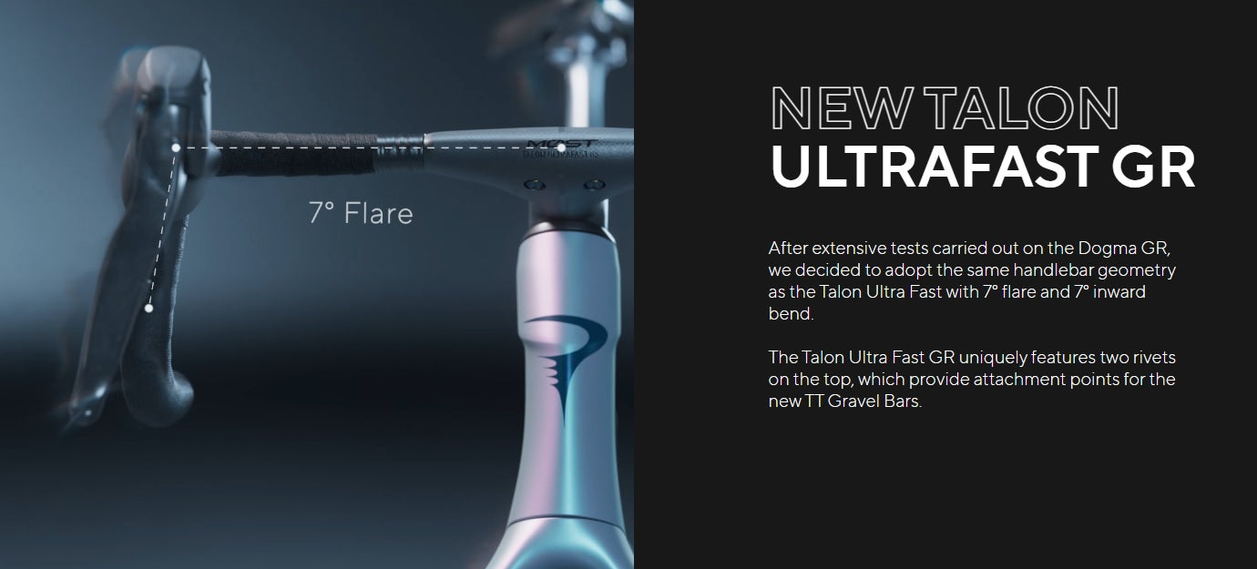 - New Talon UltraFast GR - After extensive tests carried out on the Dogma GR, Pinarello decided to adopt the same handlebar geometry as the Talon Ultra Fast with 7° flare and 7° inward bend. The Talon Ultra Fast GR uniquely features two rivets on the top, which provide attachment points for the new TT Gravel Bars.