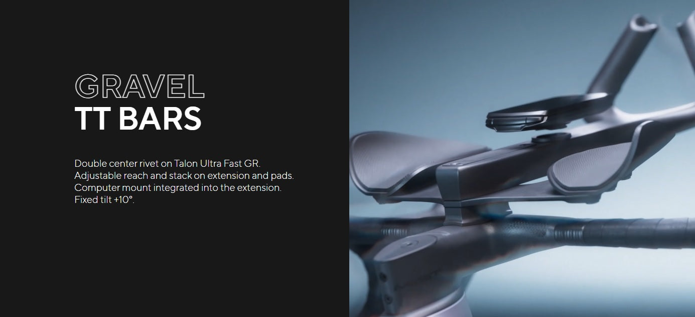 - Gravel TT Bars - Double center rivet on Talon Ultra Fast GR. Adjustable reach and stack on extension and pads. Computer mount integrated into the extension. Fixed tilt +10°.