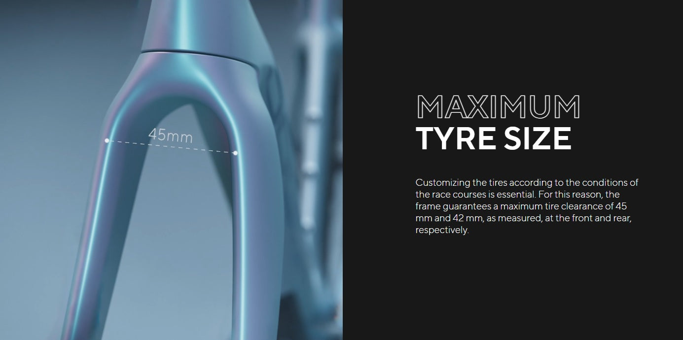 - Maximum Tire Size - Customizing the tires according to the conditions of the race courses is essential. For this reason, the frame guarantees a maximum tire clearance of 45 mm and 42 mm, as measured, at the front and rear, respectively.