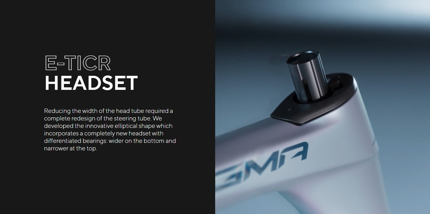 - E-Ticr Headset - Reducing the width of the head tube required a complete redesign of the steering tube. We developed the innovative elliptical shape which incorporates a completely new headset with differentiated bearings: wider on the bottom and narrower at the top.