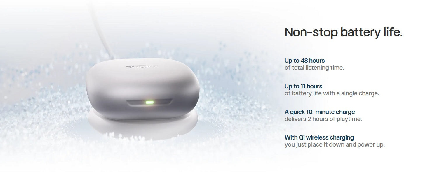 Inspired by the golden spiral, the Shokz OpenFit 2+'s flexible ear hook ensures a personalized fit. Crafted with Shokz Ultra-Soft Silicone™ 2.0, the Shokz OpenFit 2+ Wireless Earbuds offer unparalleled comfort.