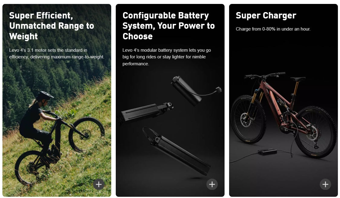 - Frame - All new Levo 4 frame, FACT 11m carbon chassis and rear-end, 12x148mm dropouts, sealed cartridge bearing pivots, SRAM UDH compatible, w/ SWAT storage, 150mm of travel, side entry battery, fork travel up to 180mm